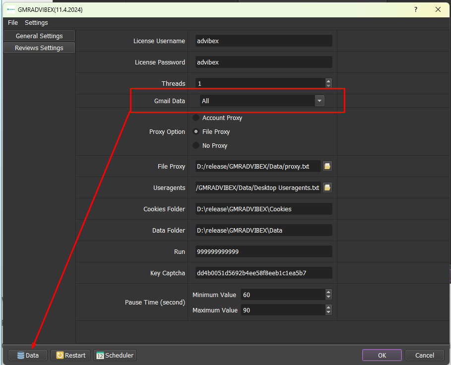 Proxy option: Choose Account Proxy ( If you want to use proxies that were imported to the Gmail Data. Choose File Proxy if you want to use proxies from a .txt file, each proxy per license in IP:Port or IP:Port:User:Password. If you don’t use proxies, choose No Proxy