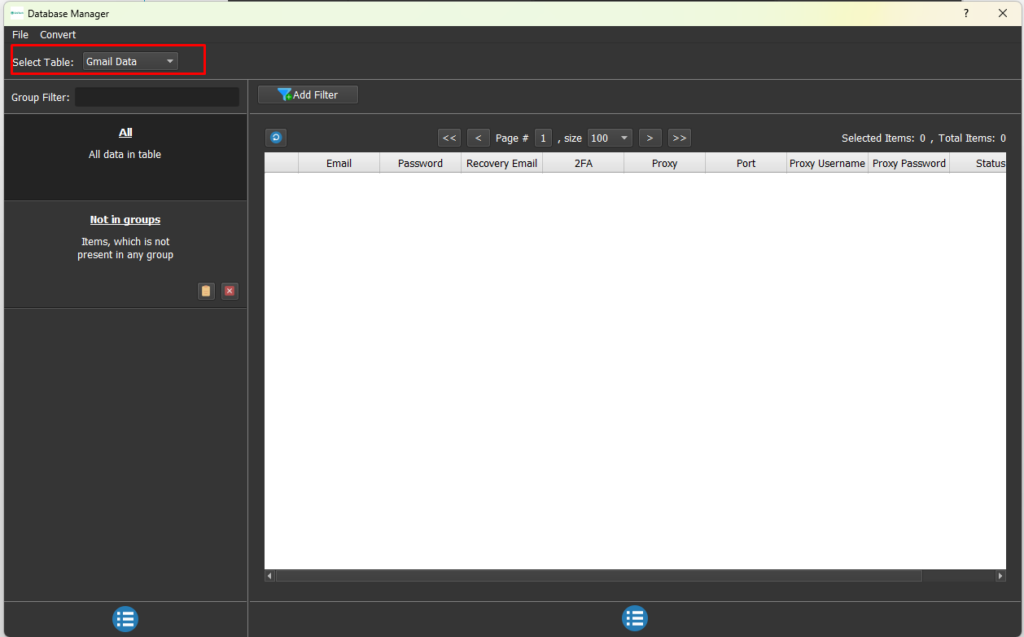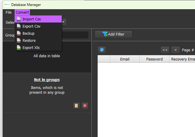 Click Convert and choose Import Csv. Create a csv file that contains the gmail accounts, each gmail account per row in the following format: Email,Password,RecoveryEmail,2FA,Proxy,Port,ProxyUsername,ProxyPassword. Leave empty for unrelated data, for example if your gmail does not have 2fa then leave 2FA field empty